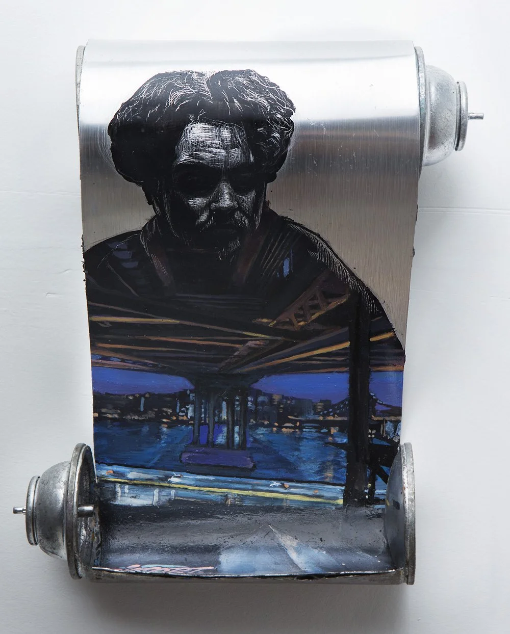 Engraving and enamel on scrolls made from aerosol cans and fire extinguishers.